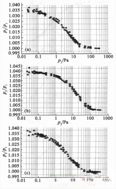 为了确定这个的范围内压强比p2/p1的准确值, 国外很多学者进行过研究, 真空技术网也对此加以探讨。文中定义p2/p1为CDG的校准因子, 即CDG的示值压强除以校准室里的标准压强, 标准压强的测量和计算均根据文献进行了温度修正。